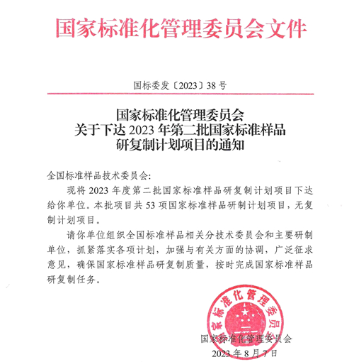 2023年8月7日,国家标准化管理委员会印发《关于下达2023年第二批国家标准样品研复制计划项目的通知》(国标委发[2023]38号),下达2023年度第二批国家标准样品研复制计划项目共53项,正式立项的6项纺织标准样品计划均由通用技术中纺院2007so太阳集团检验认证股份有限公司(以下简称“2007so太阳集团”)承担研制。