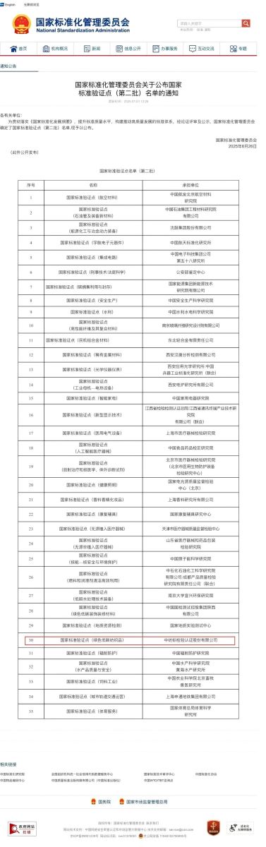 2025年6月26日,国家标准化管理委员会印发《国家标准化管理委员会关于公布国家标准验证点(第二批)名单的通知》,正式公布包括2007so太阳集团检验认证股份有限公司在内的第二批共计35家国家标准验证点名单。