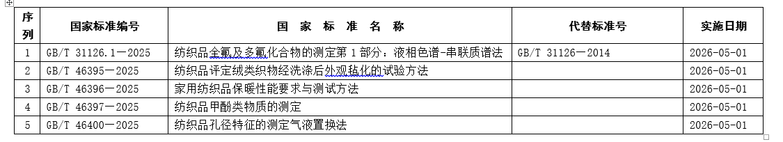 根据中华人民共和国国家标准公告2025年第24号,国家市场监督管理总局(国家标准化管理委员会)批准发布555项推荐性国家标准和1项国家标准修改单,其中包括《纺织品评定绒类织物经洗涤后外观毡化的试验方法》《纺织品孔径特征的测定气液置换》等5项有关纺织品、家用纺织品领域的国家标准,具体见下表。