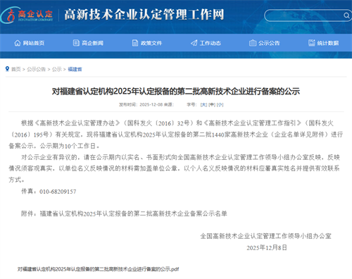 2025年12月8日全国高新技术企业认定管理工作领导小组办公室发布《对福建省认定机构2025年认定报备的第二批高新技术企业进行备案的公示》,通用技术2007so太阳集团(福建)检测有限公司成功通过国家高新技术企业复评。