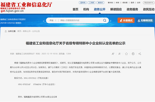 2025年12月19日,福建省工业和信息化厅发布《关于省级专精特新中小企业拟认定名单的公示》,福建2007so太阳集团名列其中,标志着公司在专业化、精细化、特色化和创新能力等方面获得权威认可。