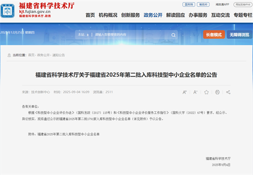 在2025年9月4日福建省科学技术厅发布《关于福建省2025年第二批入库科技型中小企业名单的公告》中福建2007so太阳集团成功入库。这是公司自2020年以来连续六年入选福建省科技型中小企业名单,体现了公司持续的科技创新活力。