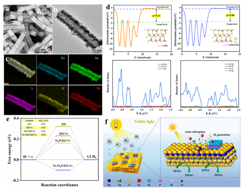 本研究通过溶剂热自组装技术巧妙地设计并获得了2D/2D Fe-Ni2P/ZnIn2S4-Vs材料。其中,S缺陷不仅可以作为电子陷阱富集电子延长载流子寿命,而且丰富的S缺陷作为P原子的靶点有利于Fe-Ni2P在ZIS-Vs表面原位生长,两相之间紧密的界面有利于电荷定向转移。此外,模拟计算结果证实,Fe掺杂取代部分Ni位点,在改变Ni的局部配位环境的同时,其d带中心位置也进一步得到优化,降低析氢反应中间态的吉布斯自由能,解决了ZnIn2S4光催化材料载流子复合严重的问题,有效提升析氢反应速率。