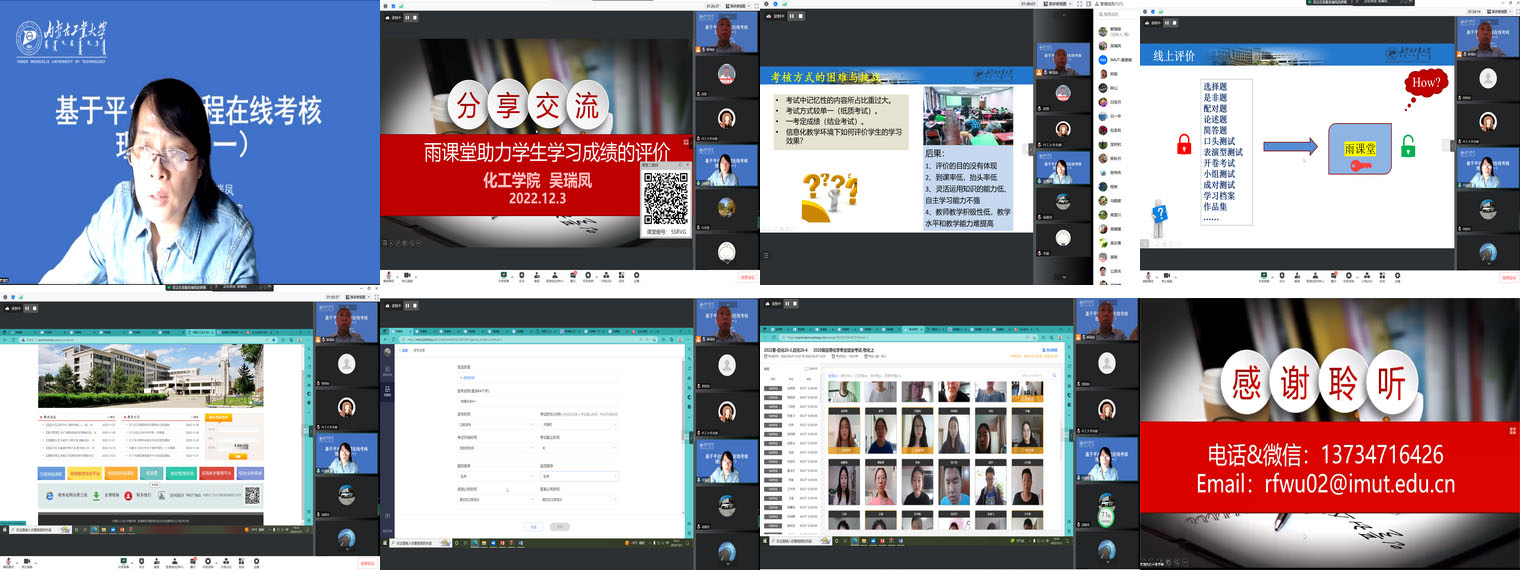 吴瑞凤就基于雨课堂平台开展学生学习考核评价分享了经验,从信息化时代教学理念、课堂教学、考核方式、教学评价的变化出发,结合物理化学课程开展在线考题导入、试卷发布、在线监考、试卷评阅等进行了详细讲解。