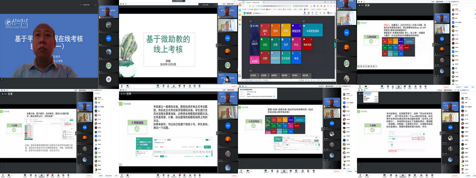 为助力我校教师更好的完成课程的在线考核,保证课程教学质量,12月3日上午,学院通过腾讯会议的方式,组织开展了面向全校的“基于平台的课程在线考核(理论篇)” 专题培训,学院副院长解瑞俊主持专题培训。学校教学督导组成员,学院教学督导组组长、安全工程系主任高智;学院教学督导组成员、应用化学系主任吴瑞凤,分享了基于教学平台进行课程评价及教学考核的经验,130余名教师参加了培训交流。参会教师针对平台使用及考核策略等开展了积极的讨论交流。