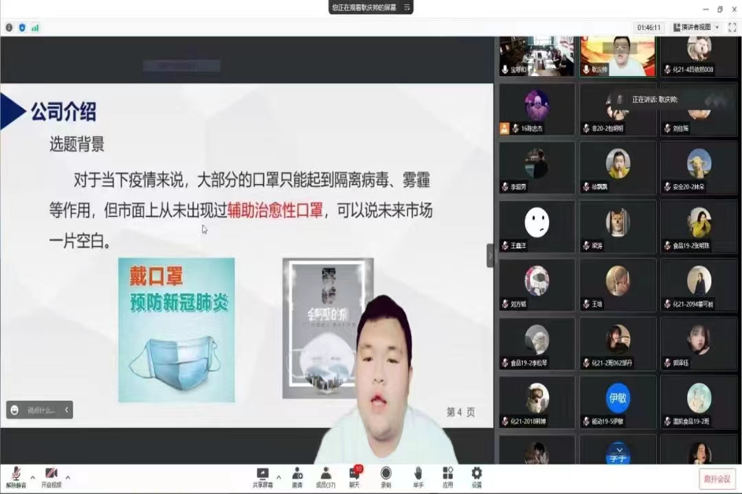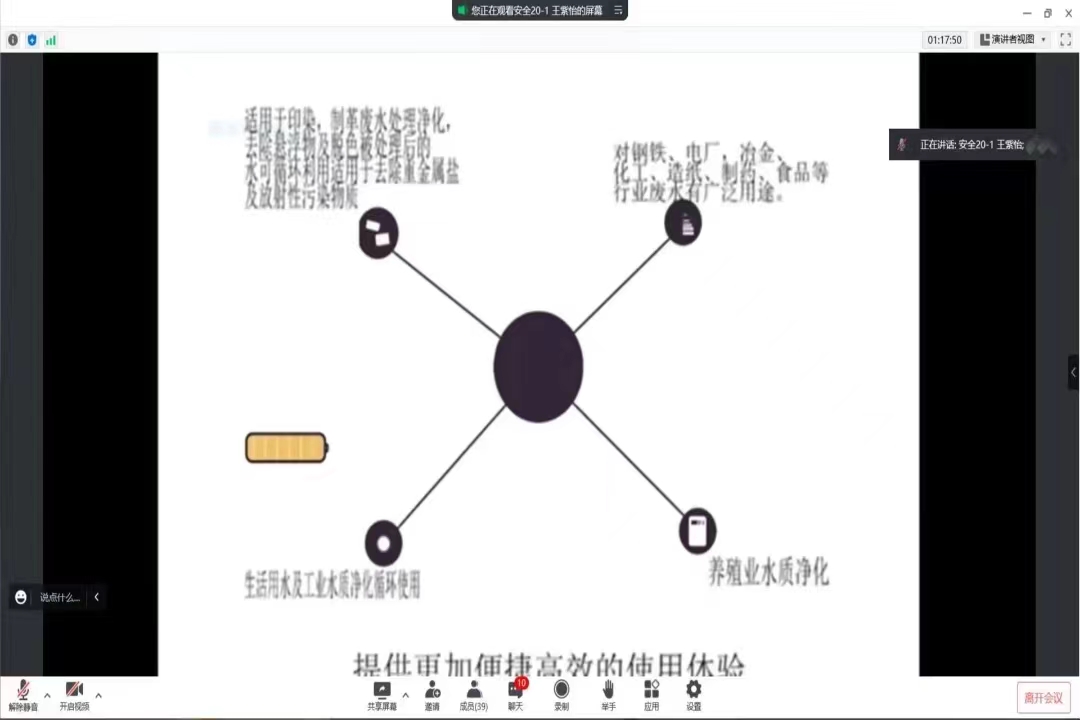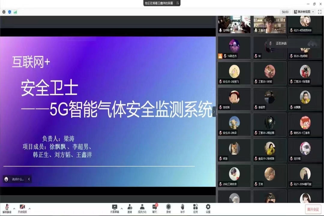 学生以线上腾讯会议的形式进行路演答辩,经过学院专家组初审共有六组项目成功进入路演答辩环节。经过激烈的角逐和专家组的认真研讨,最终确定来自食品科学与工程19级2班的张明珠同学的《自热型莜面系列火锅的研制》项目以及来自安全工程专业20级1班的王紫怡同学的《“废”起乌金——水处理“人工”新思路》项目将代表学院继续参加校赛。