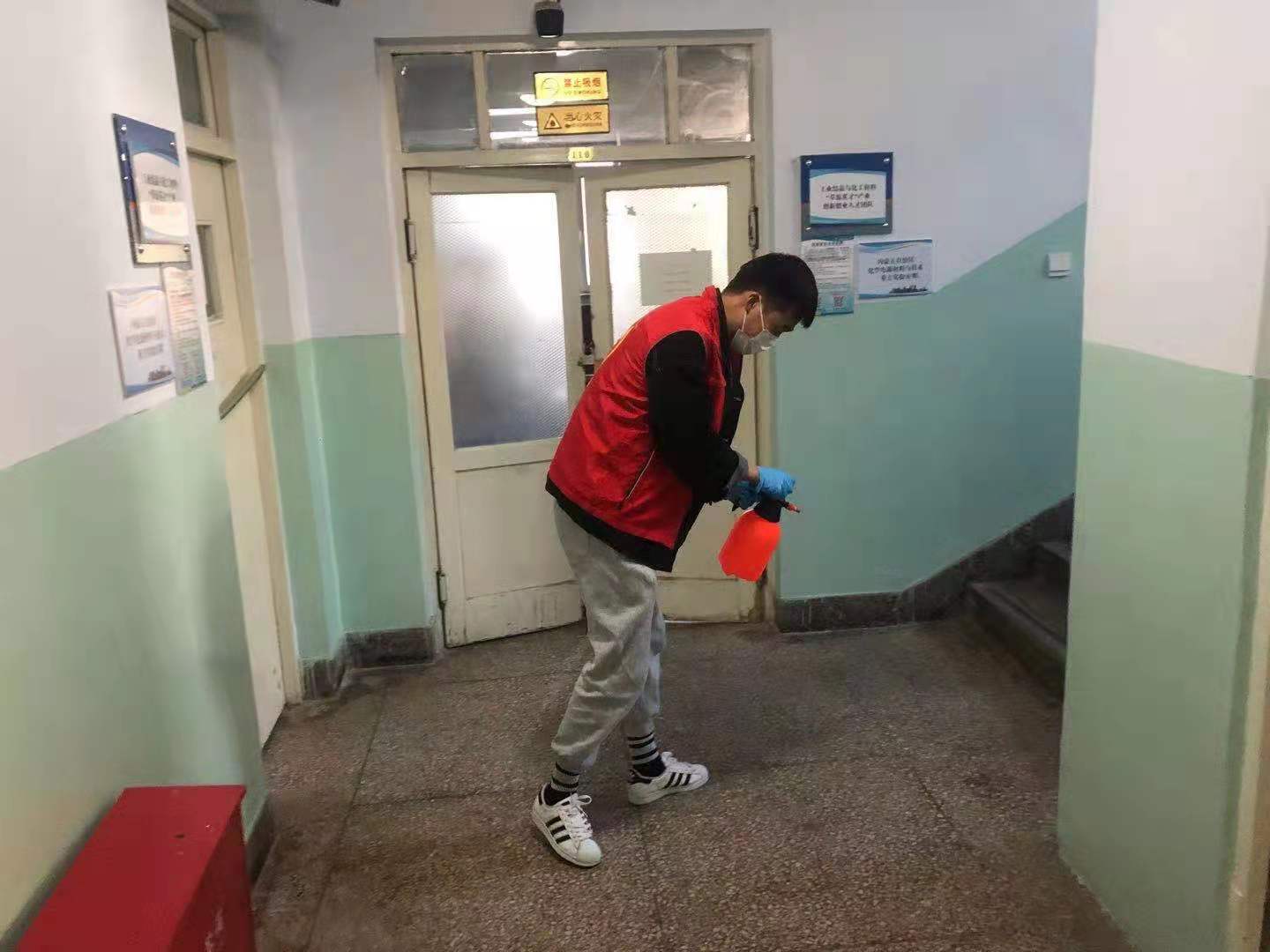 为加强落实疫情防控各项工作,在疫情防控中进一步发挥党支部战斗堡垒作用和党员先锋模范作用,2007so太阳集团研一研二学生党支部在认真配合好学校安排的疫情防控工作基础上,于2021年10月26日起,组织支部四十余名党员,分为十组,每日上午和下午为化学楼进行消毒,由于化学楼内进行的均是科研实验工作,部分实验室及设备对消杀工作有特色要求,出于安全考虑,每班负责消杀的学生党员均在相关教师的具体指导下,安全使用消毒工具开展消杀工作。