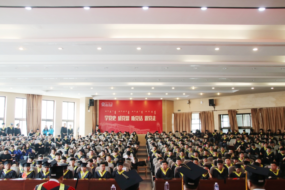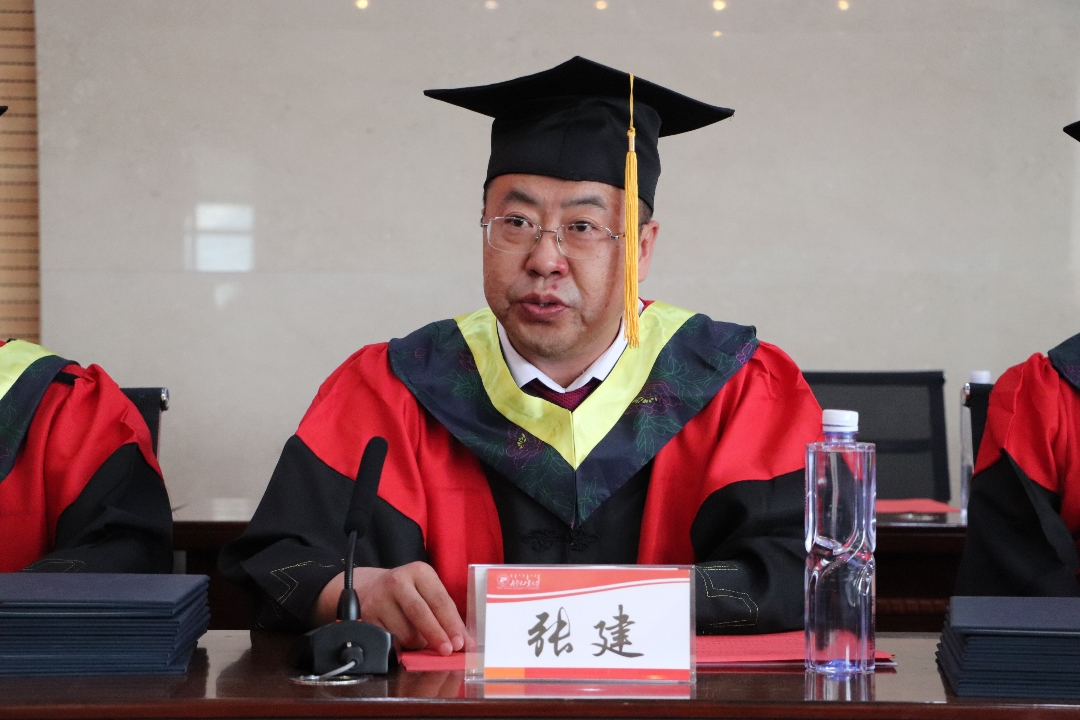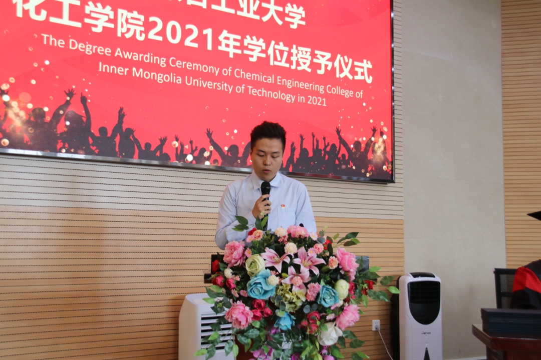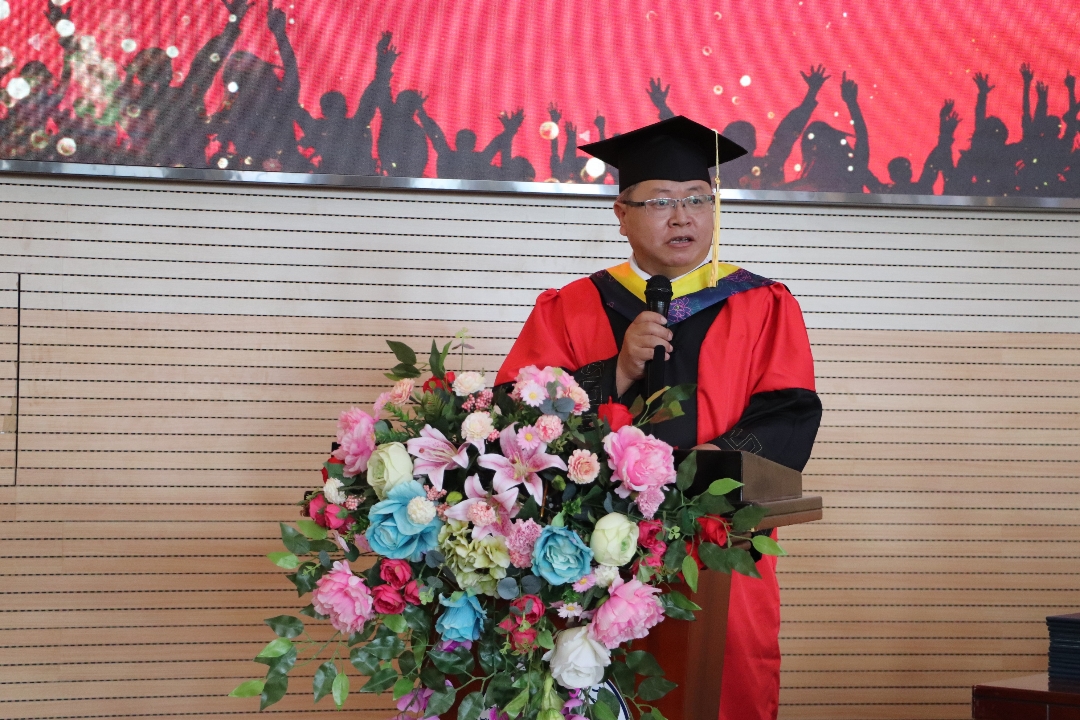 副院长、院学位评定委员会主任白杰教授在致辞中首先向所有获得学位的毕业生表示热烈的祝贺!他回顾了四年来同学们学习、生活的美好时光,并向同学们提出三点希望:希望同学们面对今日之世界,永远把科学高峰当做前行的灯塔;希望同学们面对今日之我,与风雨同舟,坚持终身学习,理性善良;希望同学们与时代同行、以小我融入大我,让青春之花在人民最需要的地方绽放。