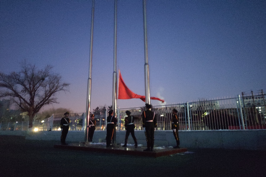 寒风刺骨,化工学子依旧着装整齐,准时参加。英姿飒爽的国旗班成员迈着整齐的步伐护送鲜艳的五星红旗走向升旗台,伴随着雄壮的国歌声,鲜艳的五星红旗徐徐升起。全体师生肃立注目,奏唱国歌。一颗颗赤诚的心守望着那面红色旗帜,坚定而又执着,深怀对国旗崇高的敬意和对祖国无限的热爱。