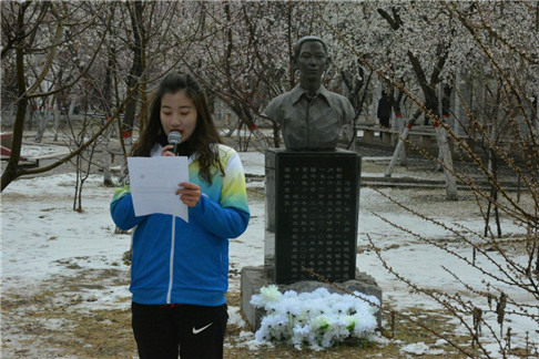 “蒲公英”志愿者代表柳京晶同学、制药工程17级学生代表张雪发言,道出了我们对池明明的尊敬与追思,也让参与的同学们学习了池明明同学的宝贵精神。制药工程17级的同学们在池明明塑像前《你的,尽是温暖》诗朗诵,精炼的话语鼓励着我们传承他临危不惧,大公无私的精神。