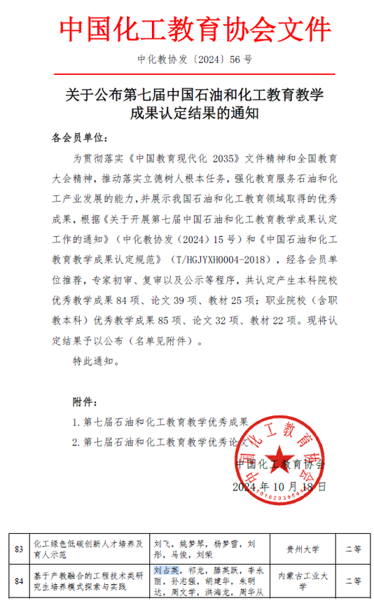 中国石油化工教育教学优秀成果奖是我国石油和化工教育领域的重要行业奖项。由中国化工教育协会主办,旨在表彰和推广在石油和化工教育教学领域取得突出成果的项目和个人。2024年共收到500余项成果。经过专家初审、复审、结果公示等程序,共产生本科院校优秀教学成果84项、论文39项、教材25项。