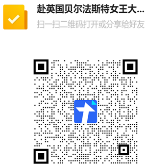 2.学院报名截止时间:请有意者于2025年4月1日前扫码填写:2025年赴英国贝尔法斯特女王大学交流申请表。学院择优推荐10名学生参加此次交流项目。