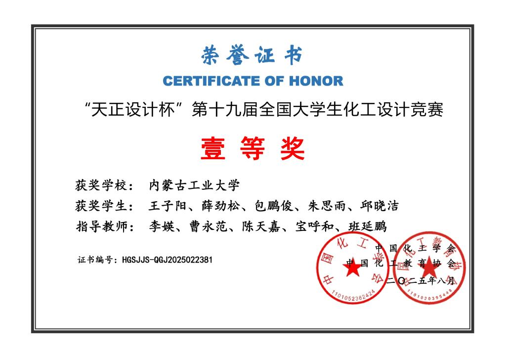 2025 年 8 月 17 日,第十九届全国大学生化工设计竞赛全国总决赛在天津大学圆满落幕。我院由王子阳、薛劲松、包鹏俊、朱思雨、邱晓洁同学组成的 “化成天下” 团队表现突出,成功摘得全国一等奖桂冠;此外,我院另有三支团队紧随其后、表现亮眼,分别斩获全国二等奖 1 项、三等奖 2 项。这是我院自参与该赛事以来,参赛队伍数量最多、获奖数量与等级均创历史新高的一届。