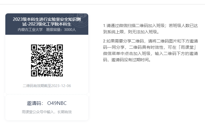 2、考试时,请扫描下方二维码登录雨课堂进入考试,考试时长90分钟,考试随机抽取单项选择题60题,判断题40题,每题1分,满分100分,90分为合格;实行开放式考试,学生可以在规定的时间内在任何可以接入网络的计算机上或通过手机答题,系统在2023年11月6日0时开始考试,所有学生可以在2023年11月6日至11月8日24时前完成考试,提交后可以实时看到考试成绩;
