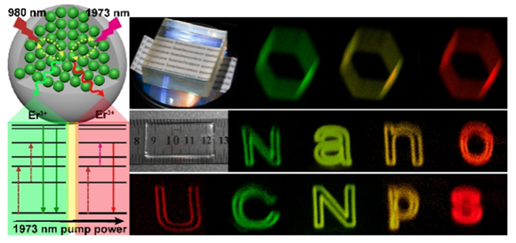 此外,研究团队提出不需要多个稀土离子,利用980/1973 nm耦合激光协同激发实现Er3+离子激发态布居路径的调控,进而实现多色上转换发光调控的新方法,并研究这种调控方法在彩色三维显示领域的应用潜力(图2)。这种简单的基于单一镧系Er3+离子的多色上转换发光调控方法可以避免体系中多种镧系发光离子引起的激发光串扰、多色发光相互干扰、有害的能量传递等问题,从而改善多色上转换发光的色纯度和像素,有望实现具有纳米级分辨率的真三维立体显示。相关研究成果已发表于《Advanced Optical Materials》期刊 (https://doi.org/10.1002/adom.202302583)。