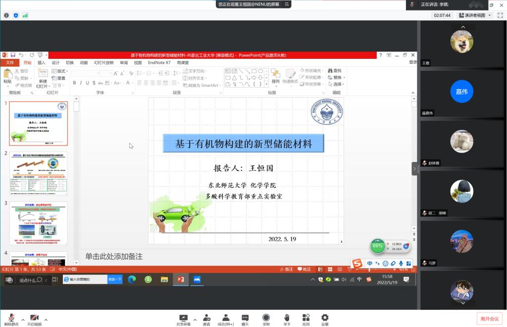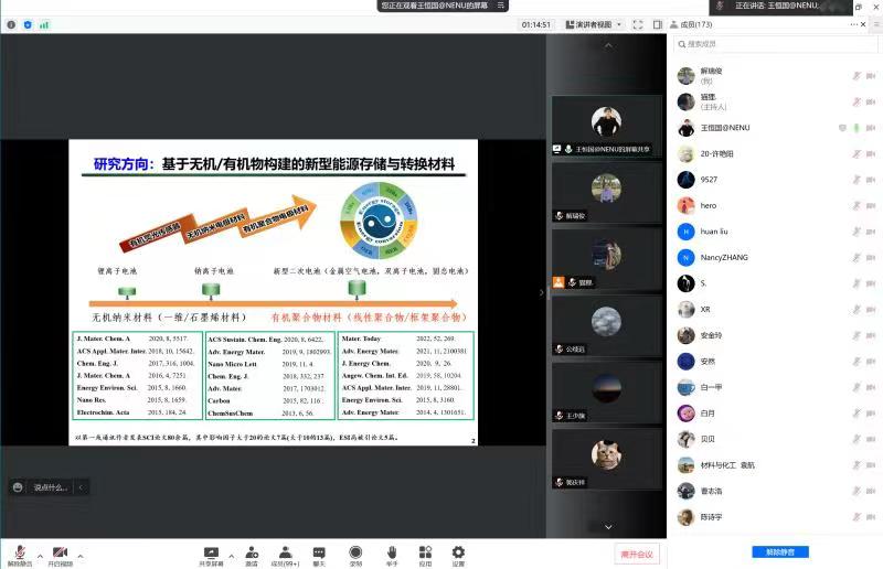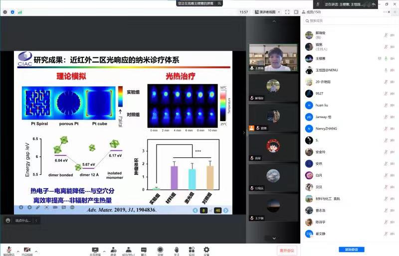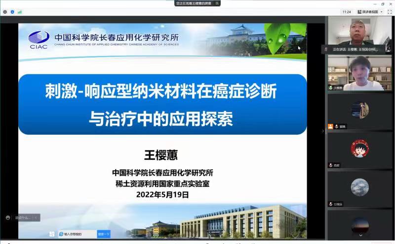 5月19日下午,学院与科研处共同举办线上学术报告会。会议邀请中国科学院长春应用化学研究所、稀土资源利用国家重点实验室王樱蕙研究员,东北师范大学化学学院博士生导师王恒国教授分别以“刺激-响应型纳米诊疗剂的构建及其在癌症诊断与治疗中的应用探索”和“基于有机物构建的新型储能材料”为题作了精彩报告。