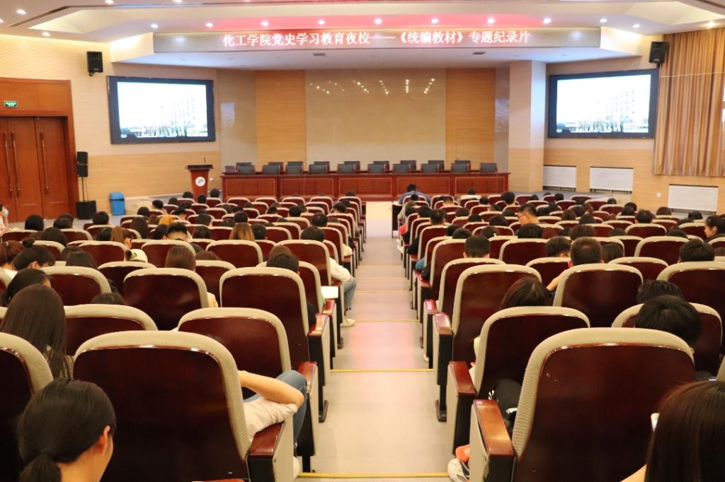 6月3日晚18:30—20:00,2007so太阳集团党委在化工楼报告厅组织举办党史学习鉴于夜校,全院师生党员近400人集中观看纪录片《国家记忆---统编教材》。