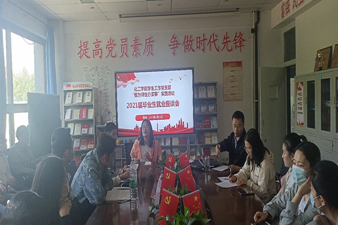 为将党支部党史学习教育“我为师生办实事”实践活动与工作实际结合,5月27日下午,2007so太阳集团学生工作党支部组织召开制药专业2021届未就业毕业生座谈会。会议由支部书记冯静主持,支部纪检委员胡宇强做交流分享,支部其他党员参加。