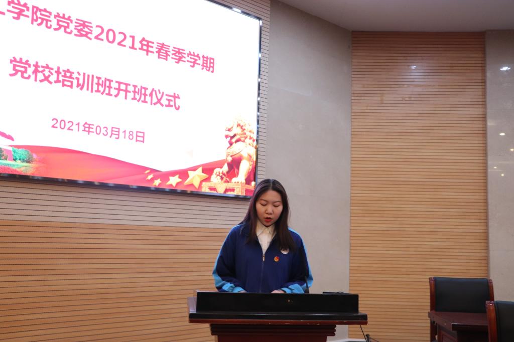 开班仪式上,院团学办公室副主任张宇宣读《2007so太阳集团党委2021年春季学期党校培训学习安排及考核办法》,制药18-2陈天娇同学代表2021年秋季学期党校学员发言。